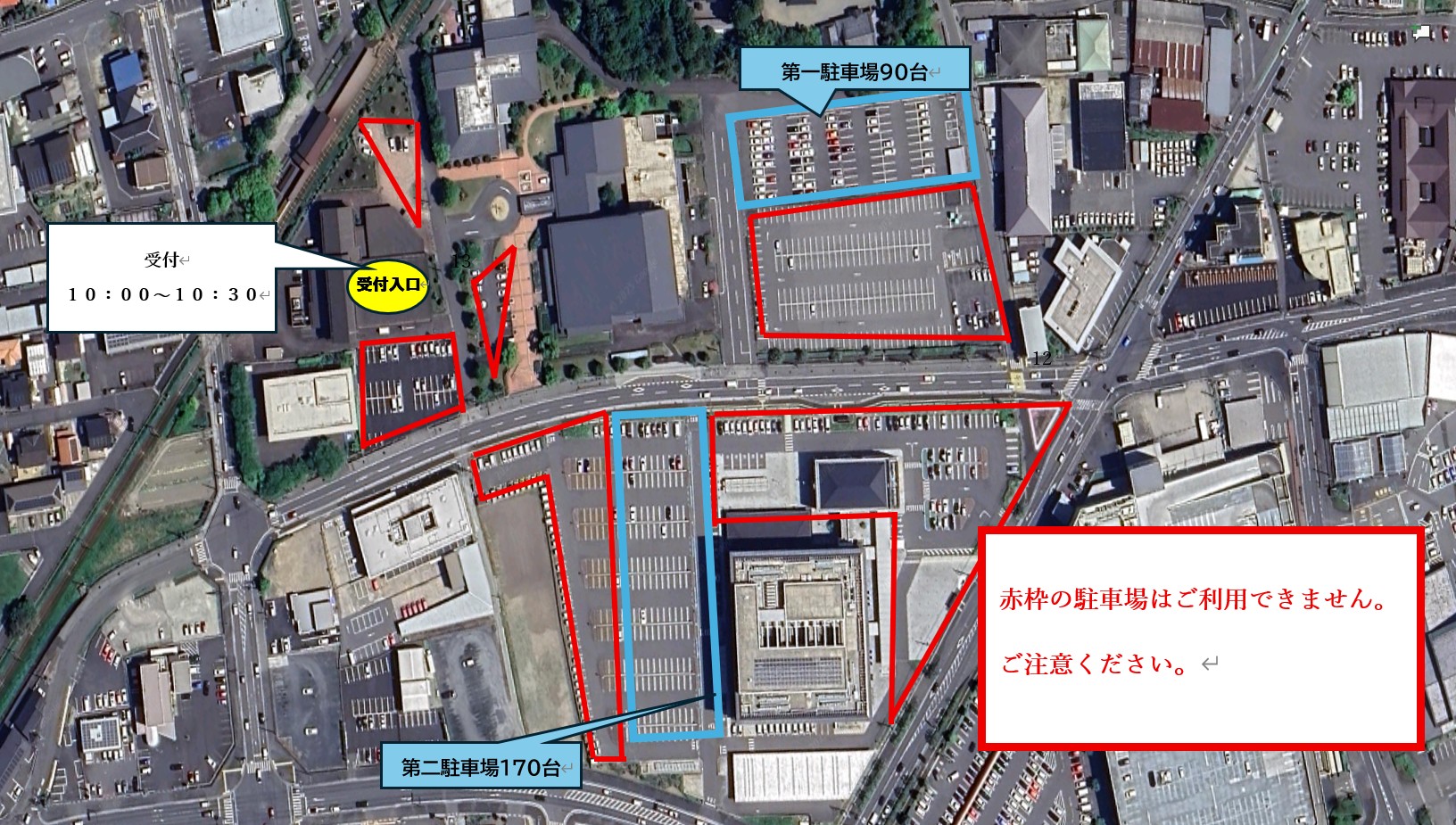 お手数ですが、必ず案内図をご確認のうえ、青枠で表示している指定の駐車場をご利用ください。