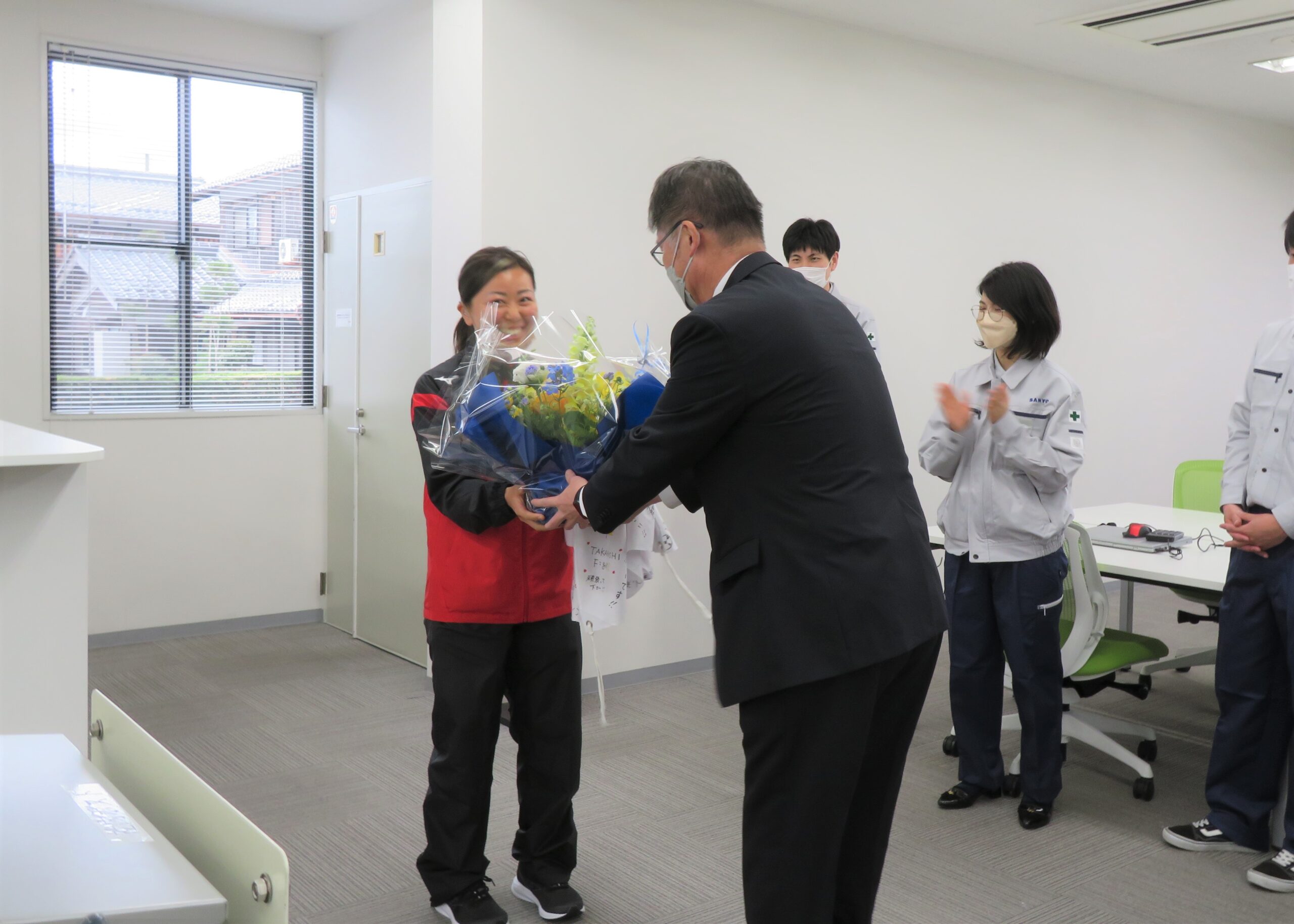花束と、社員の応援メッセージの贈呈