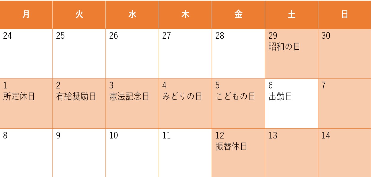 5月6日(土)は出勤日となり、12日(金)が振替休日となります。